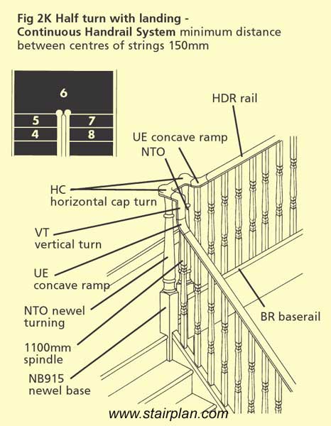 Here you can see a continuous handrail detail where the handrail goes over the newel post. there is a UE up easing and VT vertical turn forming a Goose neck handrail detail coming into a HC horizontal cap that sits on top of the NT0 newel turning that is used with the continuous handrail system. Handrail to Handrail connections are jointed using handrail bolts.